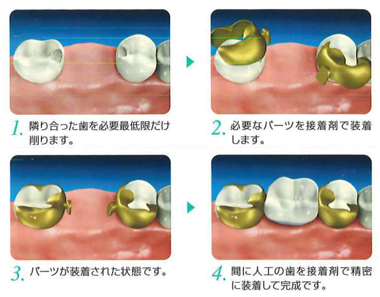 4.「ポンティック」と呼ばれる人工歯を接着剤にて着けます。噛み合わせの確認を行い終了となります。